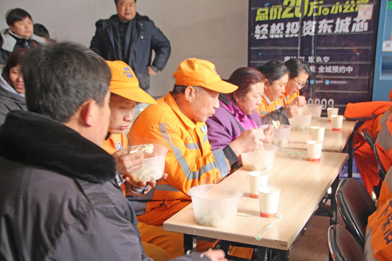 午饭时间一到,环卫工人开始陆续到达现场,桑守正副书记首先向到来的环卫工人们表达了感谢,并送去新年祝福。随后,党员突击队队员们把一碗碗热腾腾的水饺递到环卫工人的手中,大家津津有味的吃着水饺,队员们看在眼里,暖在心里。
