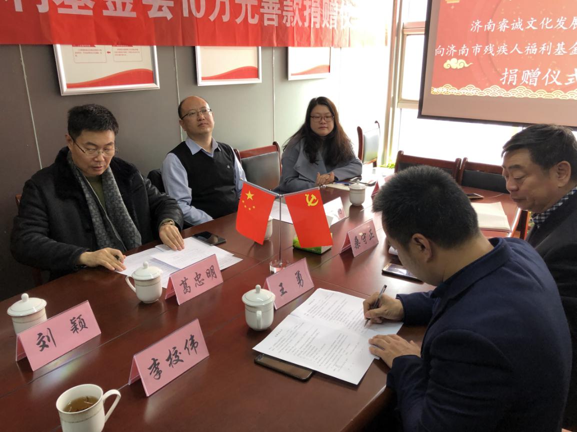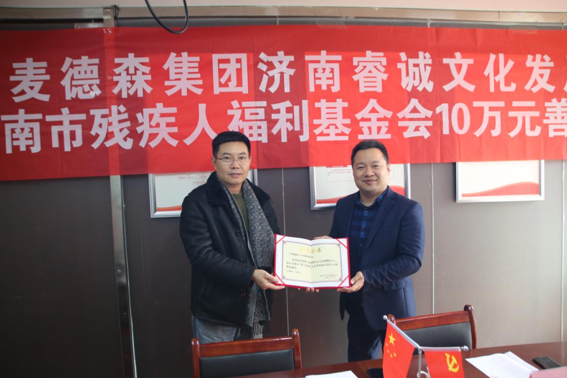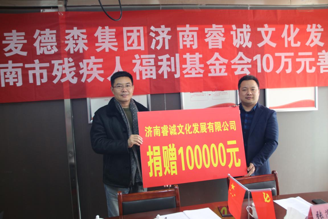 2月12日上午,新年开工第一天,必威平台旗下济南睿诚文化发展有限公司向济南市残疾人福利基金会捐赠善款10万元。