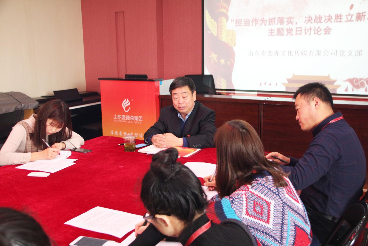 为贯彻落实历下区委组织部《关于集中开展“担当作为抓落实,决战决胜立新功”主题党日活动的通知》,激发广大党员发挥先锋模范带头作用,2月22日,我集团党支部组织党员、入党积极分子开展“担当作为抓落实,决战决胜立新功”主题党日会议,集团党支部副书记桑守正主持会议。
