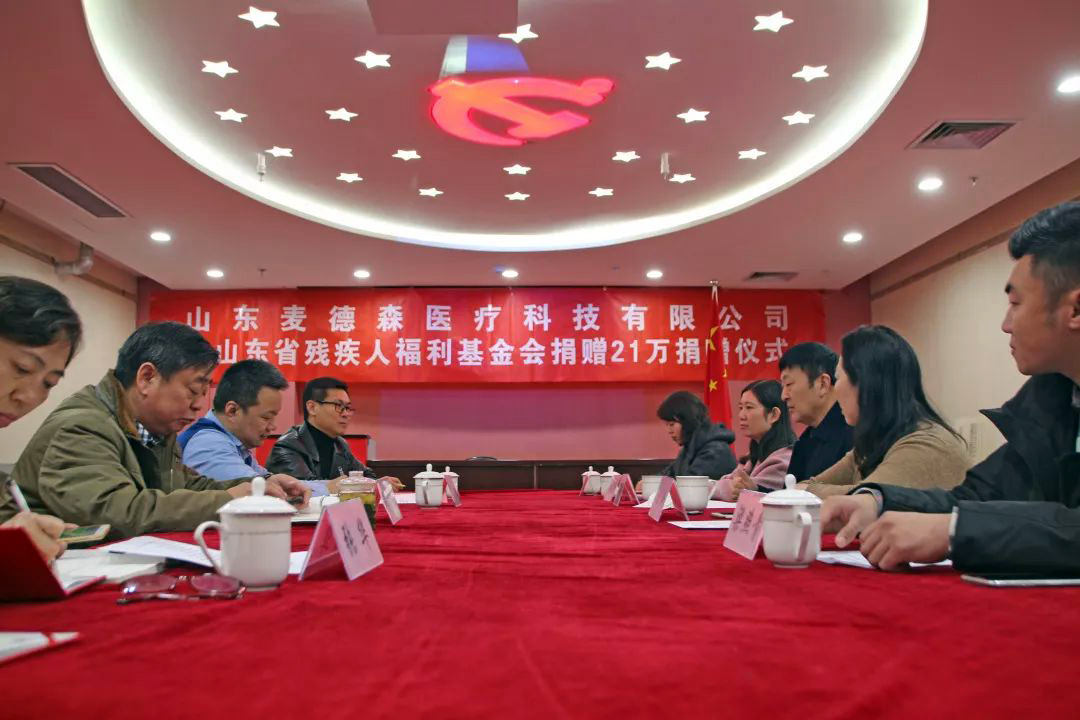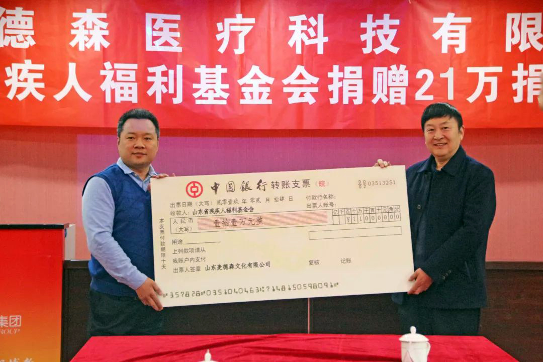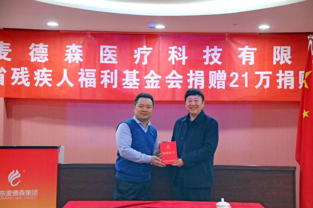 为积极承担企业社会责任,进一步推进扶残助学慈善工作的开展,2月14日,我集团向山东省残疾人福利基金会捐赠助残善款21万元。