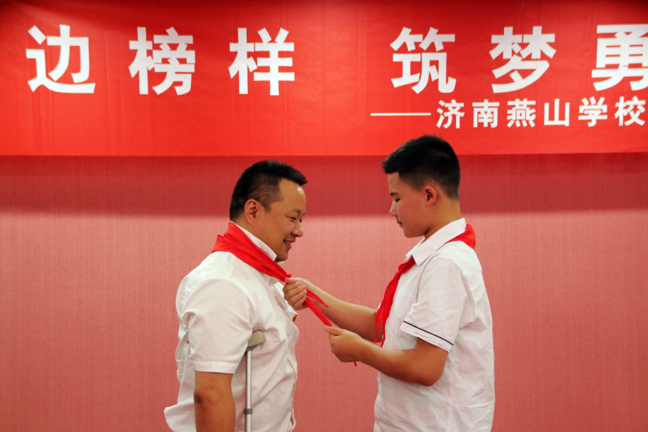 少先队员们首先观看了王勇博士的专题纪录片《拄着双拐一路奔跑》。观影过后,少先队员代表为王勇叔叔佩戴红领巾。
