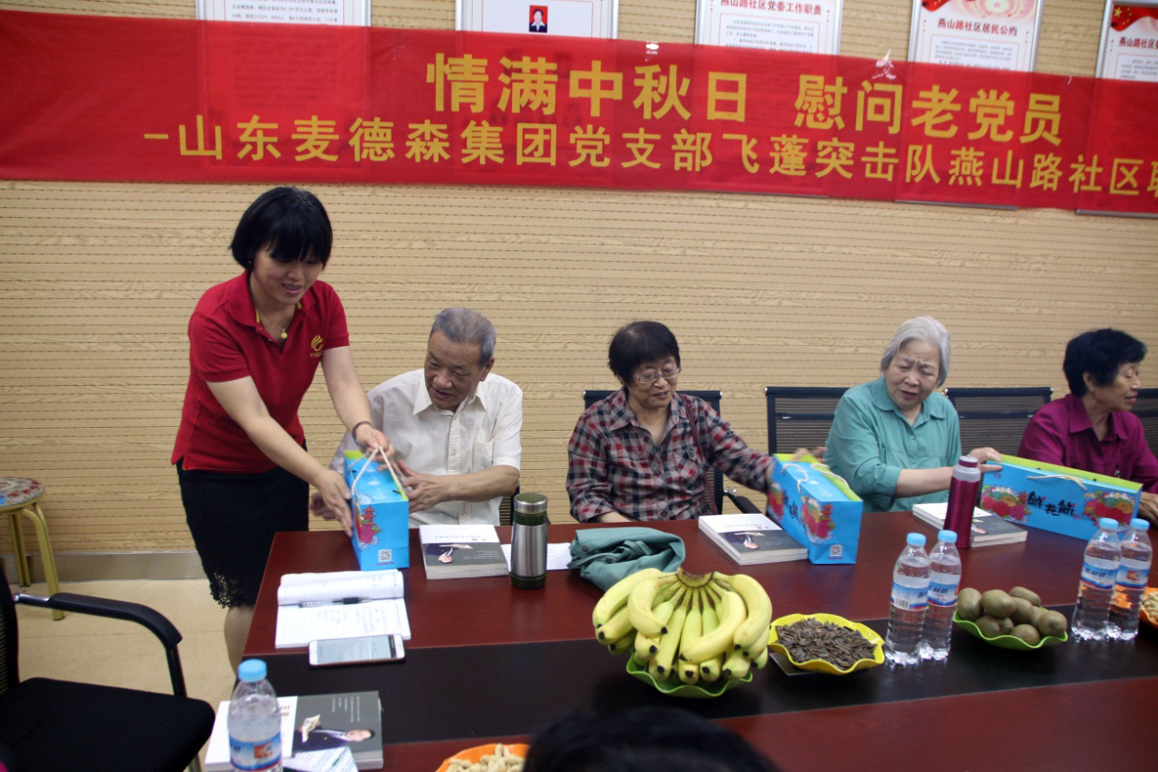 为庆祝祖国七十华诞,继承和弘扬党的优良传统和作风,在中秋佳节来临之际,9月11日下午,我集团党员突击队飞蓬队来到燕山路社区开展“情满中秋日、慰问老党员”联谊活动。燕山路社区党委蒋红梅书记出席活动,集团党支部桑守正副书记、工会张晶华主席携飞蓬突击队部分队员参加活动。