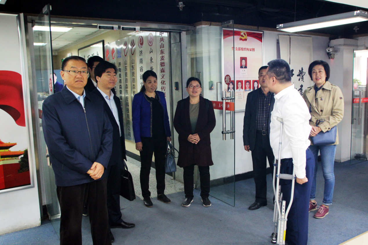 在王勇博士的陪同下,民营企业高质量发展服务队历下3队一行先后参观了企业党建宣传墙、党建活动室、企业荣誉展架以及各业务职能部门办公区域,对我集团党支部建设、企业经营情况以及安置残障人士就业等情况进行了详细了解。