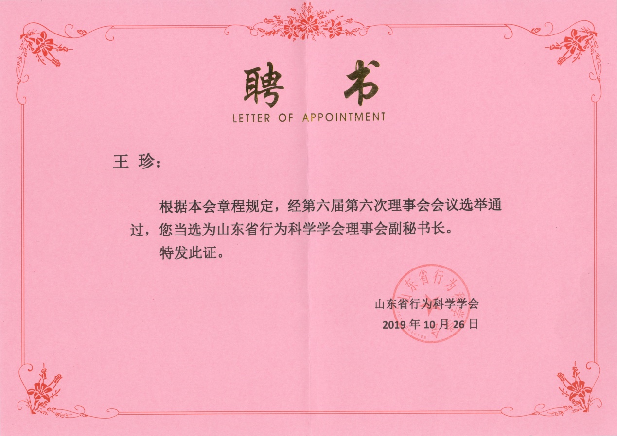 山东省行为科学学会秘书长黄少英为我集团人力资源部王珍颁发山东省行为科学学会副秘书长聘书