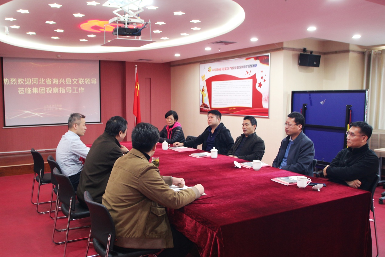11月13日,河北省海兴县宣传部副部长、文联主席李树勤等领导一行莅临我集团考察指导工作,并召开座谈会。受集团党支部书记王勇博士委托,党支部副书记桑守正、执行董事王兴法等陪同考察。
